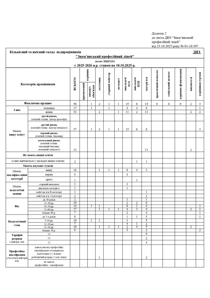 ДНЗ “Знам’янський професійний ліцей” забезпечений кваліфікованими педагогічними кадрами відповідно до кадрових вимог щодо забезпечення започаткування та провадження освітньої діяльності на певному рівні професійної (професійно-технічної) освіти: