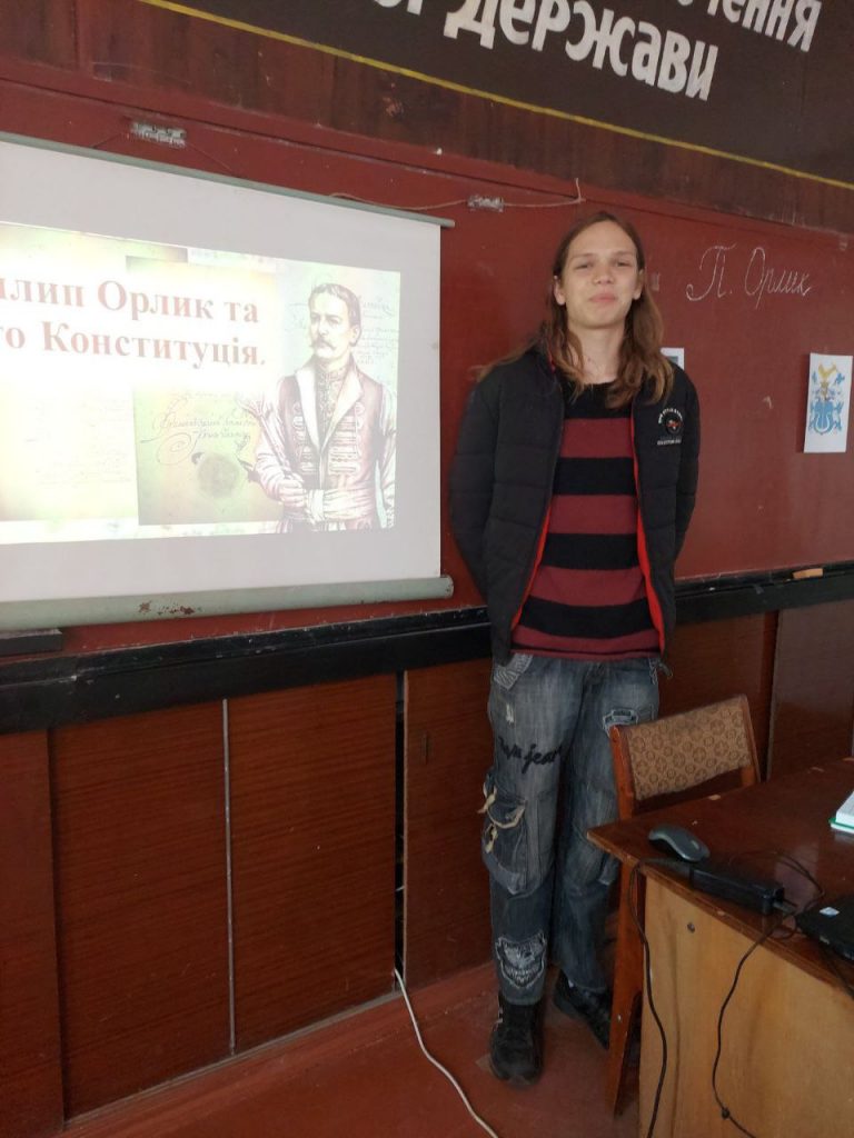 Історія України сповнена яскравих постатей, які відіграли ключову роль у формуванні державності. Однією з них є Пилип Орлик – видатний гетьман, автор І української конституції. Викладач історії І.Свінченко провела із учнями ДНЗ “Знам’янський профліцей” історичний дайджест “Пилип Орлик – постать в історії”, під час якого пригадали основні віхи його біографії, ознайомилися з презентацією “П.Орлик та його конституція”.