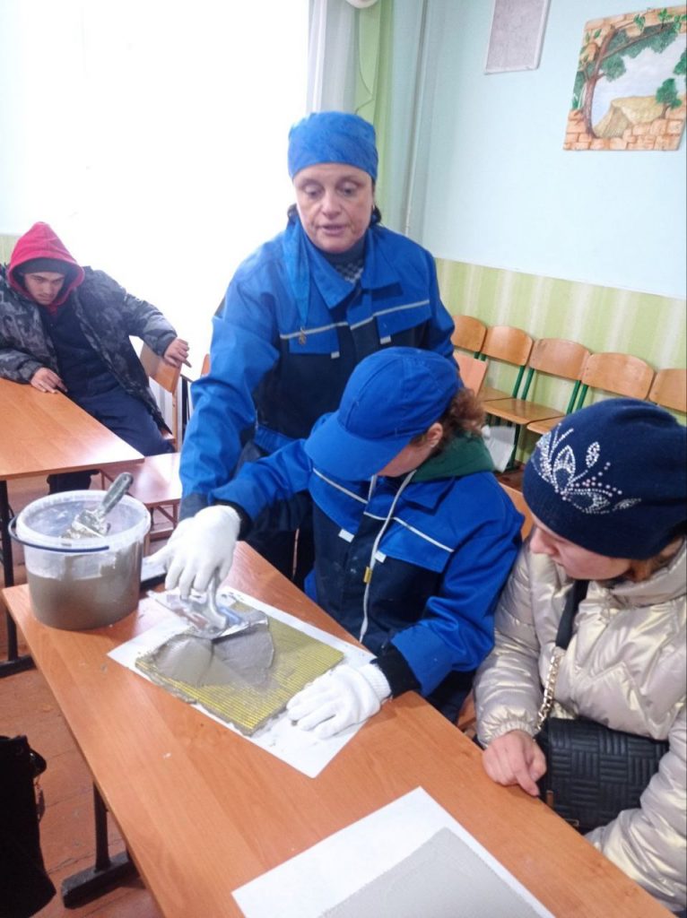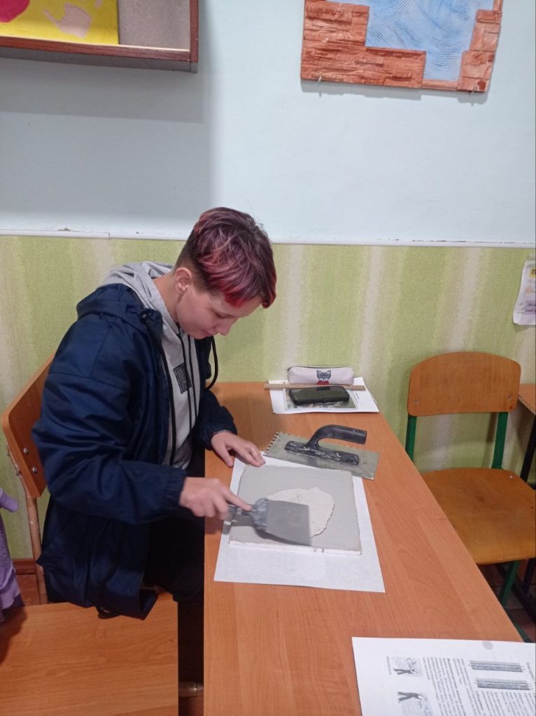 Здобувачі освіти з особливими освітніми потребами під час майстер-класу опановували технологію нанесення акрилових та камінцевих декоративних розчинів поки що на підготовлені зразки пінополістирольних плит.
