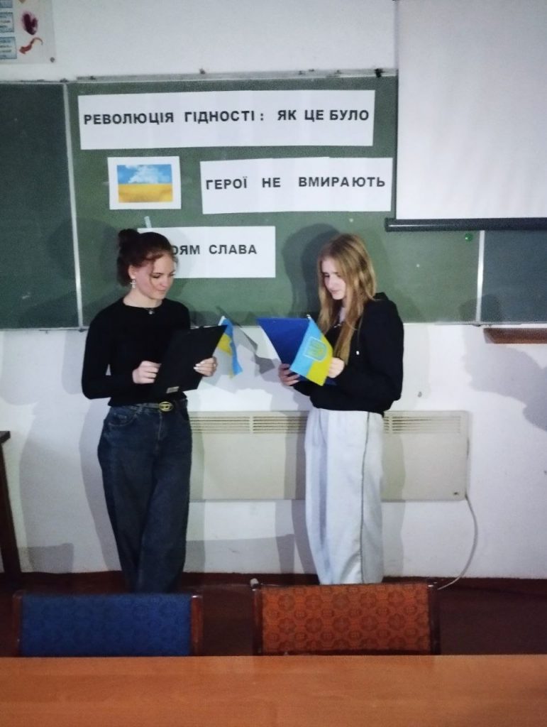 Були проведені тематичні години, під час яких пригадали ключові етапи Революції Гідності, переглянули документальні матеріали, обговорили роль молоді у державотворчих процесах, значення цінностей свободи, гідності для сучасного суспільства, підкреслили їх самовідданість, готовність захищати європейський вибір України.