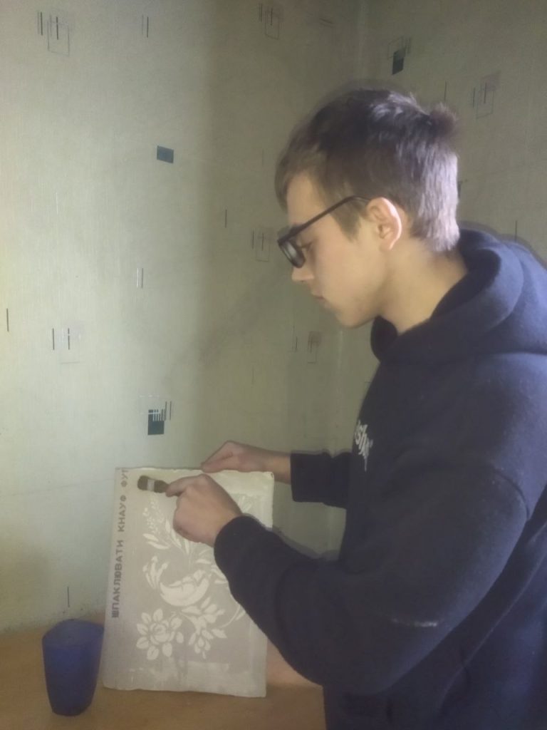 Здобувачі освіти з особливими освітніми потребами, які опановують професію «Штукатур» в ДНЗ “Знам’янський професійний ліцей”, демонструють надзвичайну наполегливість і відповідальність навіть під час дистанційного навчання в домашніх умовах та за умов систематичних відключень електроенергії. Під час відпрацювання теми “Нанесення декоративної штукатурки” вчаться виконувати її під трафарет. Учні працюють на підготовлених заготовках з гіпсокартону, послідовно виконуючи всі технологічні операції: