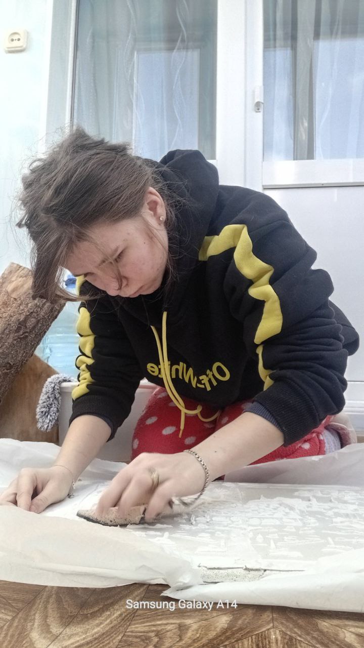 Здобувачі освіти з особливими освітніми потребами, які опановують професію «Штукатур» в ДНЗ “Знам’янський професійний ліцей”, демонструють надзвичайну наполегливість і відповідальність навіть під час дистанційного навчання в домашніх умовах та за умов систематичних відключень електроенергії. Під час відпрацювання теми “Нанесення декоративної штукатурки” вчаться виконувати її під трафарет. Учні працюють на підготовлених заготовках з гіпсокартону, послідовно виконуючи всі технологічні операції:
