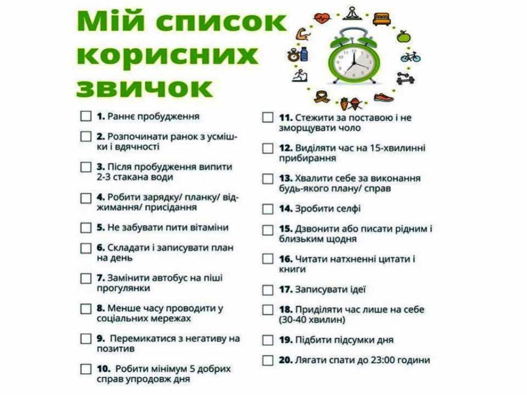 Під час інформаційних, виховних, класних годин, годин спілкування, бесід, засідань за “круглим столом”, ігор, дайджестів, постерів піднімалися питання здорового способу життя. Підлітки аналізували вчинки, вчилися обачності в умовах воєнного стану, грали в ігри “Норм чи стрьом для здоров’я”, надавали першу медичну допомогу, згадували шкідливі, корисні звички, складали “корисні” чек-листи, робили висновки.