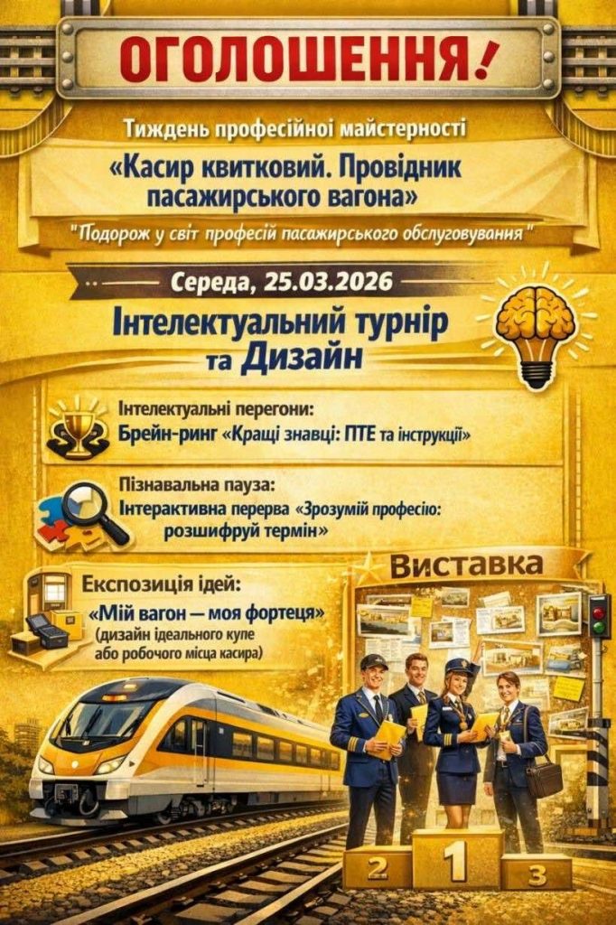 Виставка-колаж «Мій вагон — моя фортеця». Учасники представили креативні роботи з дизайном ідеального купе та робочого місця касира. Кожен проєкт вирізнявся оригінальністю, практичністю та любов’ю до майбутньої професії.
